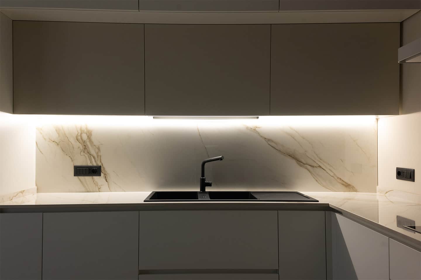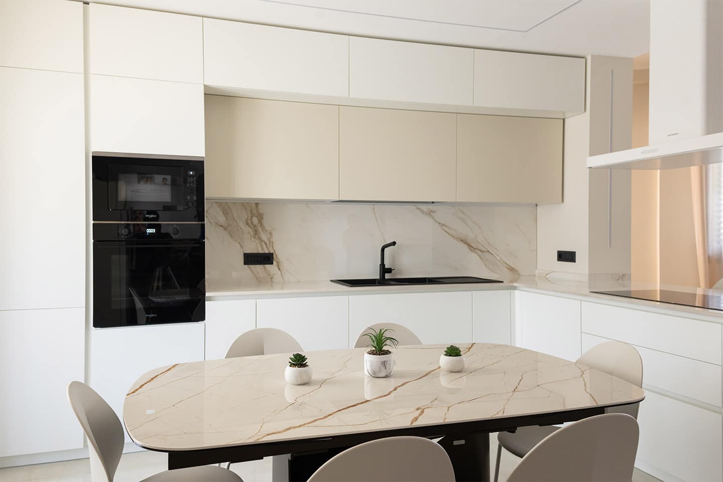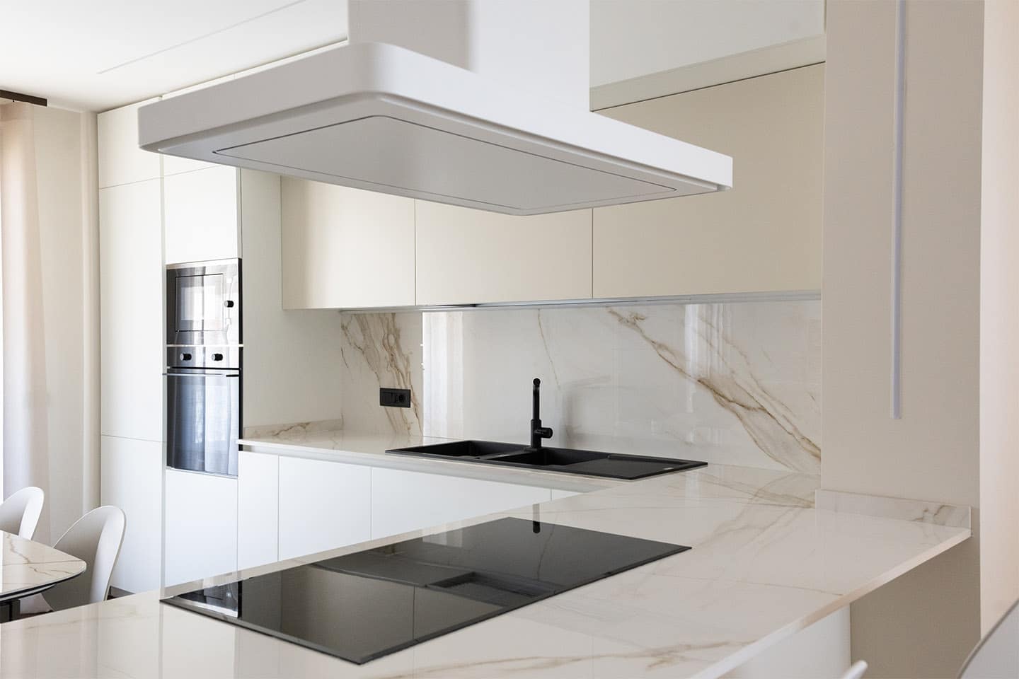 Die von Mobili Nasso gestaltete Einrichtung hat den Wohnraum in eine helle und einladende Umgebung verwandelt, in der jedes Detail darauf ausgerichtet ist, Funktion und Schönheit in Einklang zu bringen. Die neutrale Farbpalette, die hellen Oberflächen und die Maserung des Marmors schaffen eine raffinierte Atmosphäre, die durch das natürliche Licht, das den Raum durchflutet, noch verstärkt wird. Die perfekte Balance zwischen Design und Komfort, typisch für den Stil von Armony.